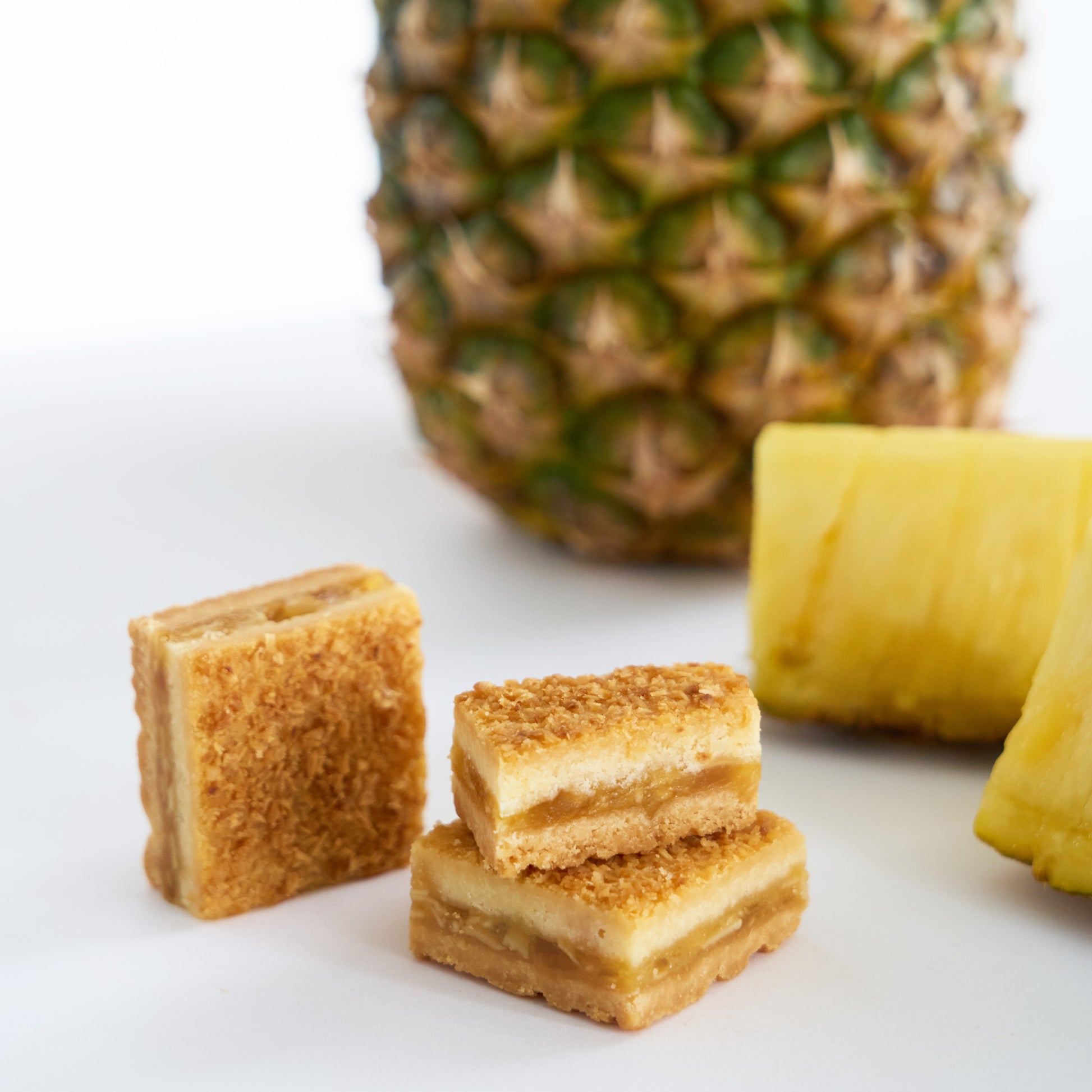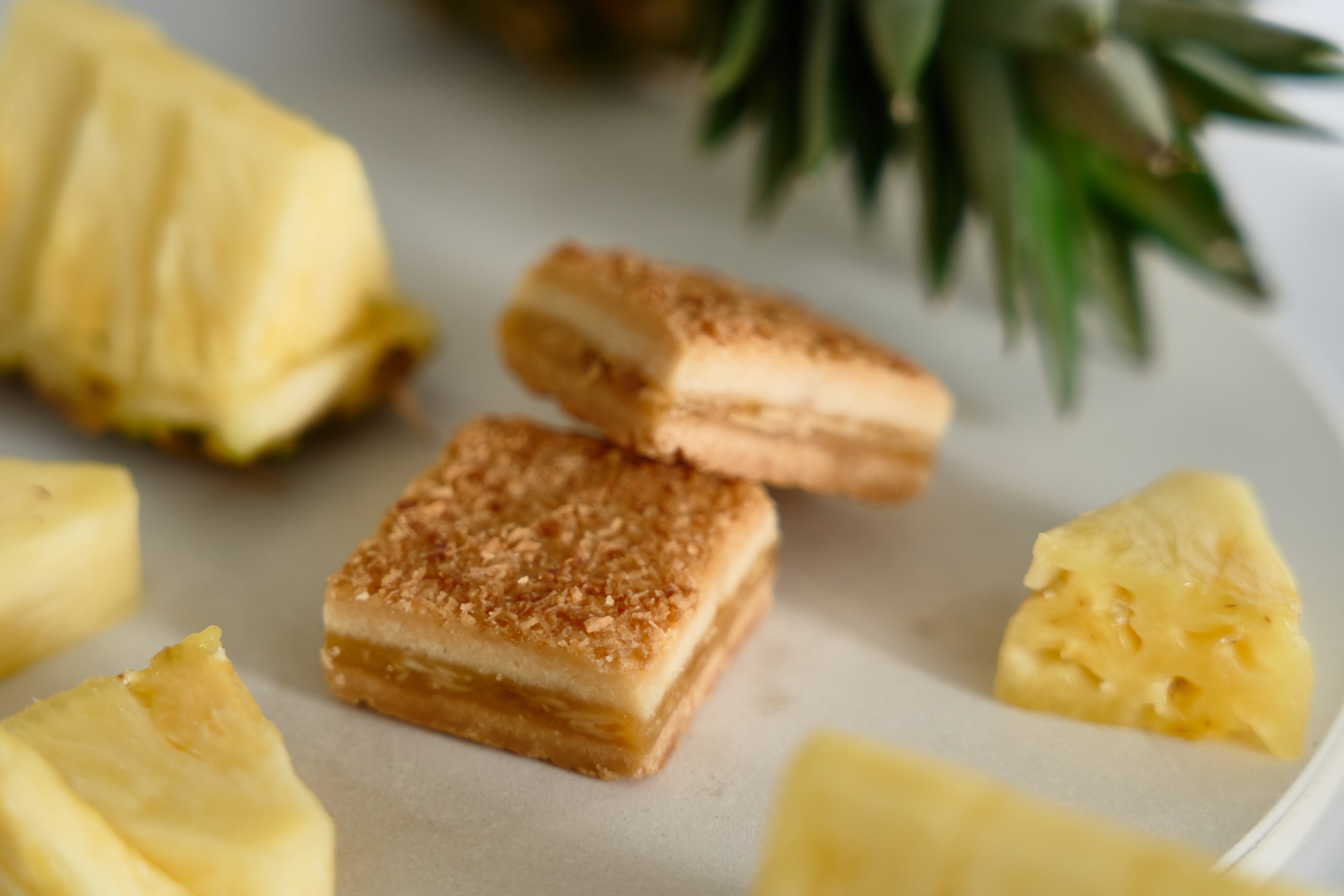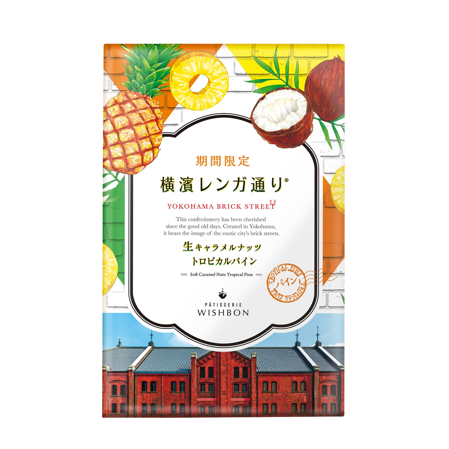 自家製生キャラメルにパインの果肉とパインとパッションフルーツのペーストを練り込んで、クッキーにサンドして焼き上げました。太陽の恵みを受けた南国果実たちをたっぷりと使った、夏にぴったりの横濱レンガ通りです。