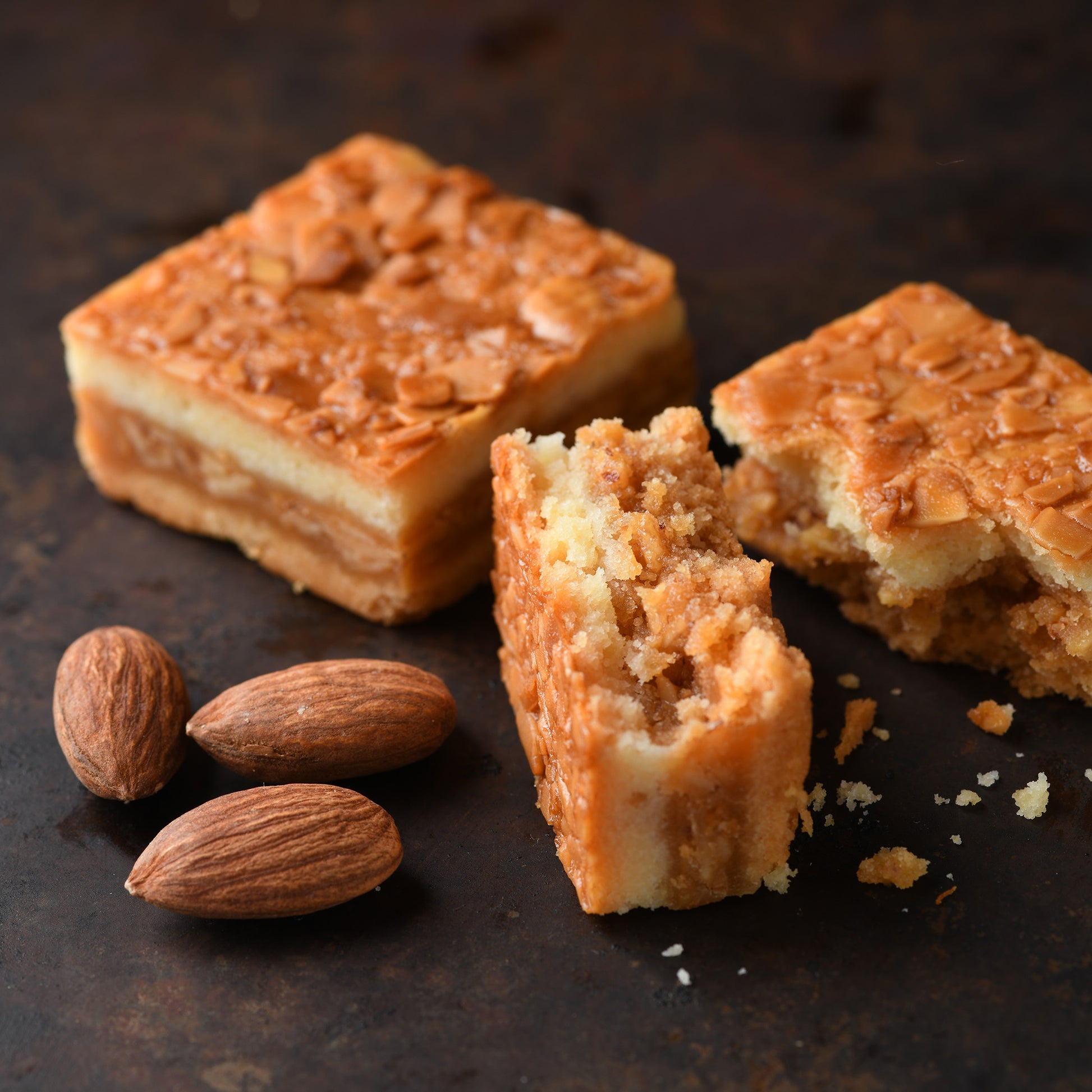 香ばしくローストしたアーモンドに自家製生キャラメルを絡め 特製のクッキー生地でサンドし、じっくり焼き上げました。パティシエが心を込めて炊き上げた自家製生キャラメルは「素材」「製法」「火加減」がおいしさの秘訣。