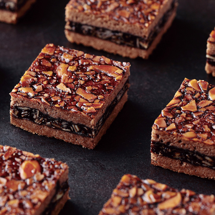 ローストしたアーモンドをショコラ味の自家製生キャラメルとからめ、風味豊かなココアクッキーでサンドし、じっくりと焼き上げました。香ばしいアーモンドとカカオ香る濃厚生キャラメルの絶妙なバランスを是非お楽しみください。